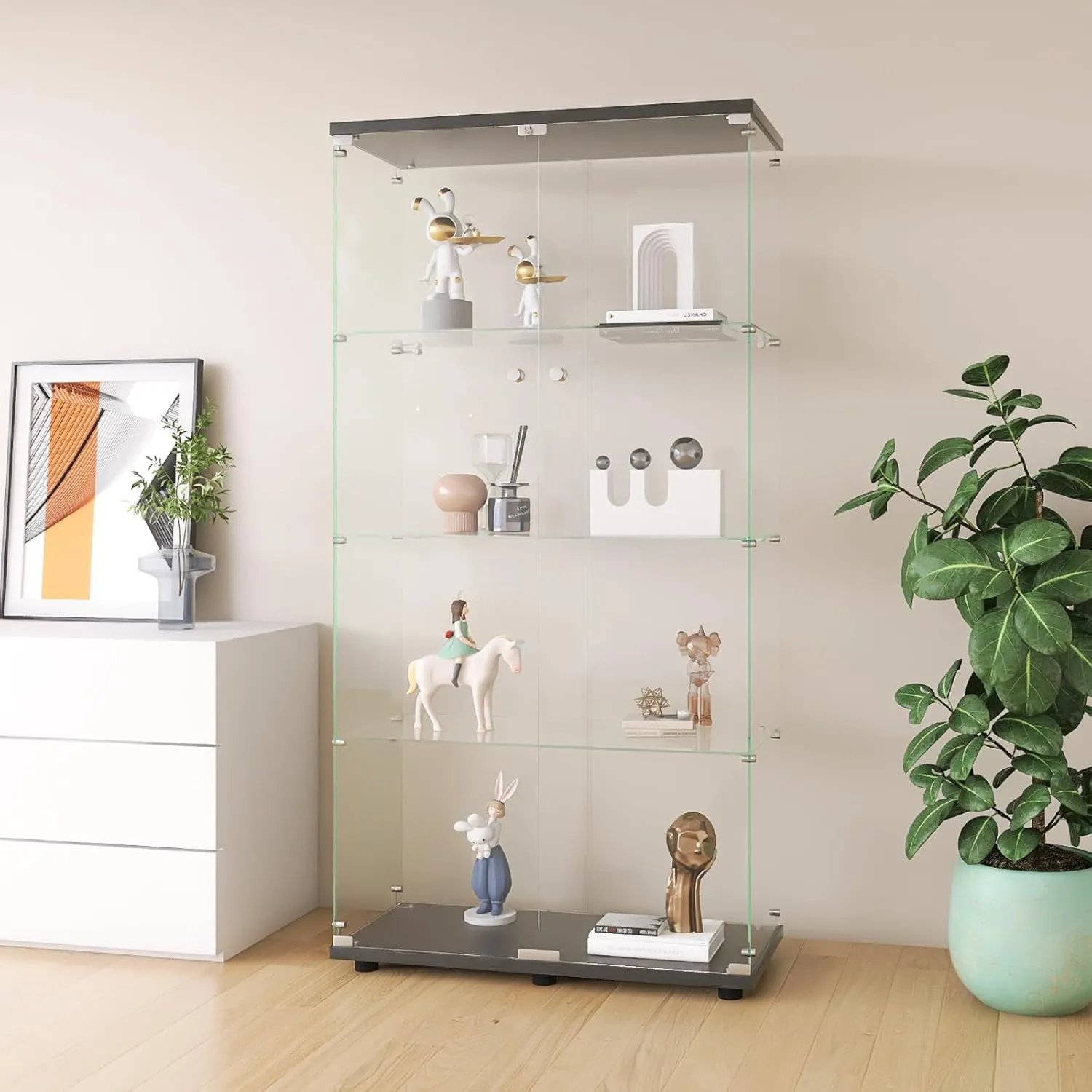 Portes Doubles avec Verrouillage : La vitrine présente une structure à double porte avec un système de protection pour vos objets, qu'il s'agisse de figurines, de bijoux ou d'objets décoratifs. Les charnières métalliques assurent une ouverture et une fermeture fluides, tandis que le verrou renforce la sécurité. Verre Trempé, Clarté et Durabilité : Fabriquée en verre trempé, cette vitrine offre une bonne transparence pour mettre en valeur vos expositions. Le verre est résistant aux chocs et aux rayures, assurant sa longévité. L'effet miroir intégré augmente la profondeur visuelle. Polyvalente pour Divers Usages : Que ce soit dans un salon, un bureau ou une chambre, cette vitrine s'adapte à vos besoins d'exposition. Elle propose plusieurs niveaux de rangement pour organiser des collections de figurines, œuvres d'art miniatures, accessoires de décoration ou souvenirs. Détails de Conception : Chaque élément est travaillé avec soin : les fixations métalliques garantissent une stabilité, évitant tout balancement. Les pieds réglables compensent les irrégularités du sol, et les bords de verre polis évitent les éraflures.
