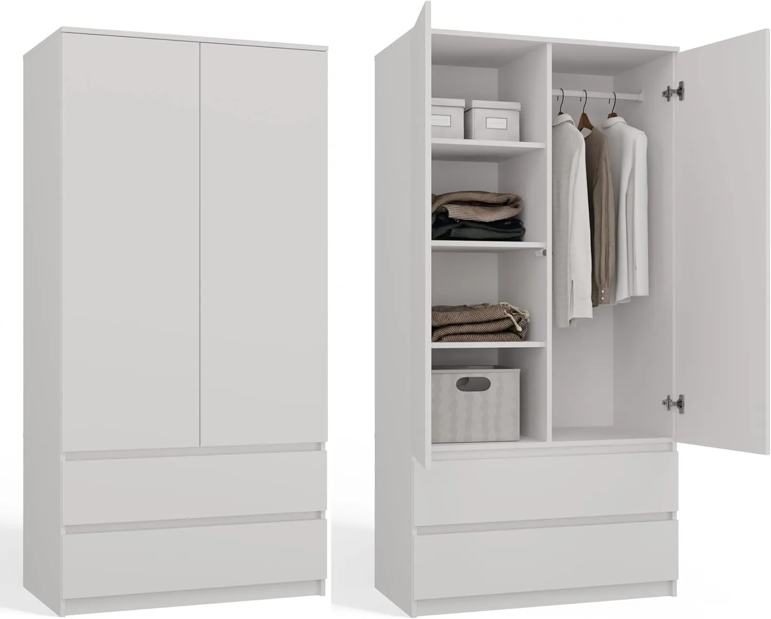 Cette armoire compacte propose un espace de rangement pour les vêtements, vestes et accessoires. Elle est destinée aux chambres d'enfants, d'adolescents ou de bébés. Elle comprend une tringle à vêtements, quatre étagères réglables et deux tiroirs pour l'organisation. Les portes sans poignées avec le système TIP-ON s'ouvrent d'une simple pression. Fabriquée en panneaux de particules mélaminés, ce meuble est conçu pour un usage quotidien. Les dimensions de l'armoire sont adaptées aux petites pièces.