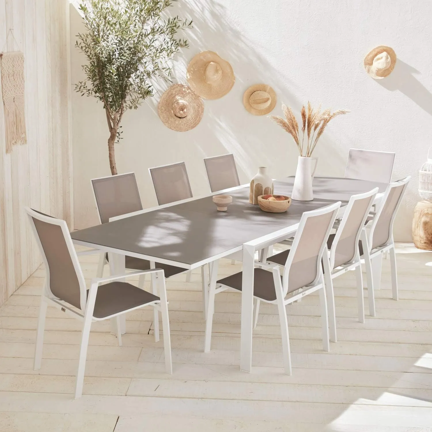 Ensemble de 2 Fauteuils Empilables Washington en Aluminium Blanc et Textilène Taupe