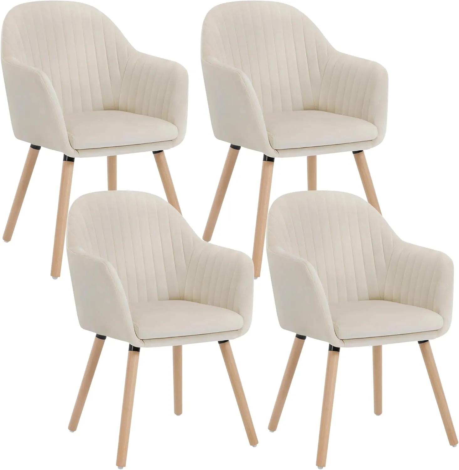 Ensemble de 4 Fauteuils en Velours avec Accoudoirs et Pieds en Bois Massif, Crème Blanche