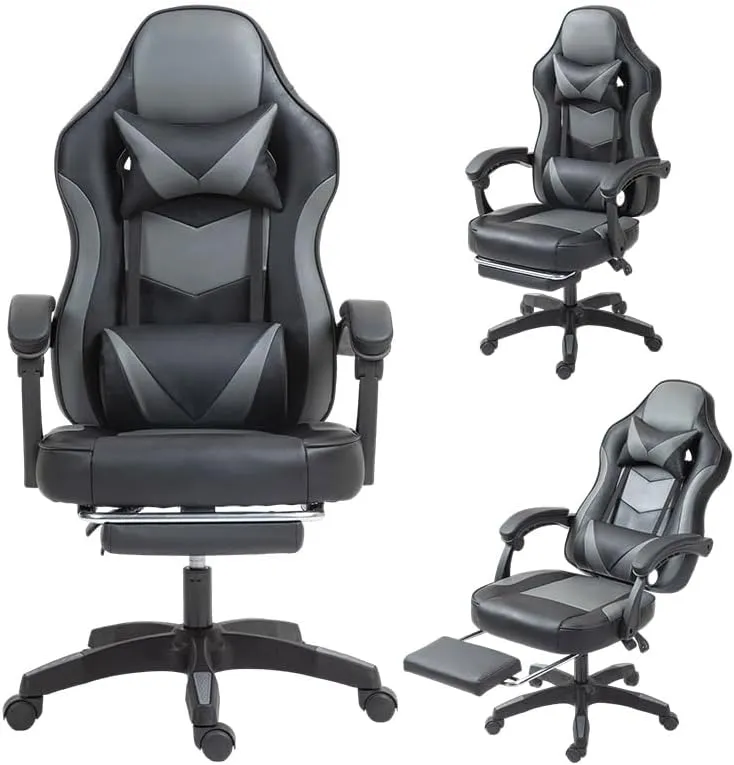 Fauteuil de Jeu Ergonomique avec Repose-Pied et Support Lombaire - Noir et Gris