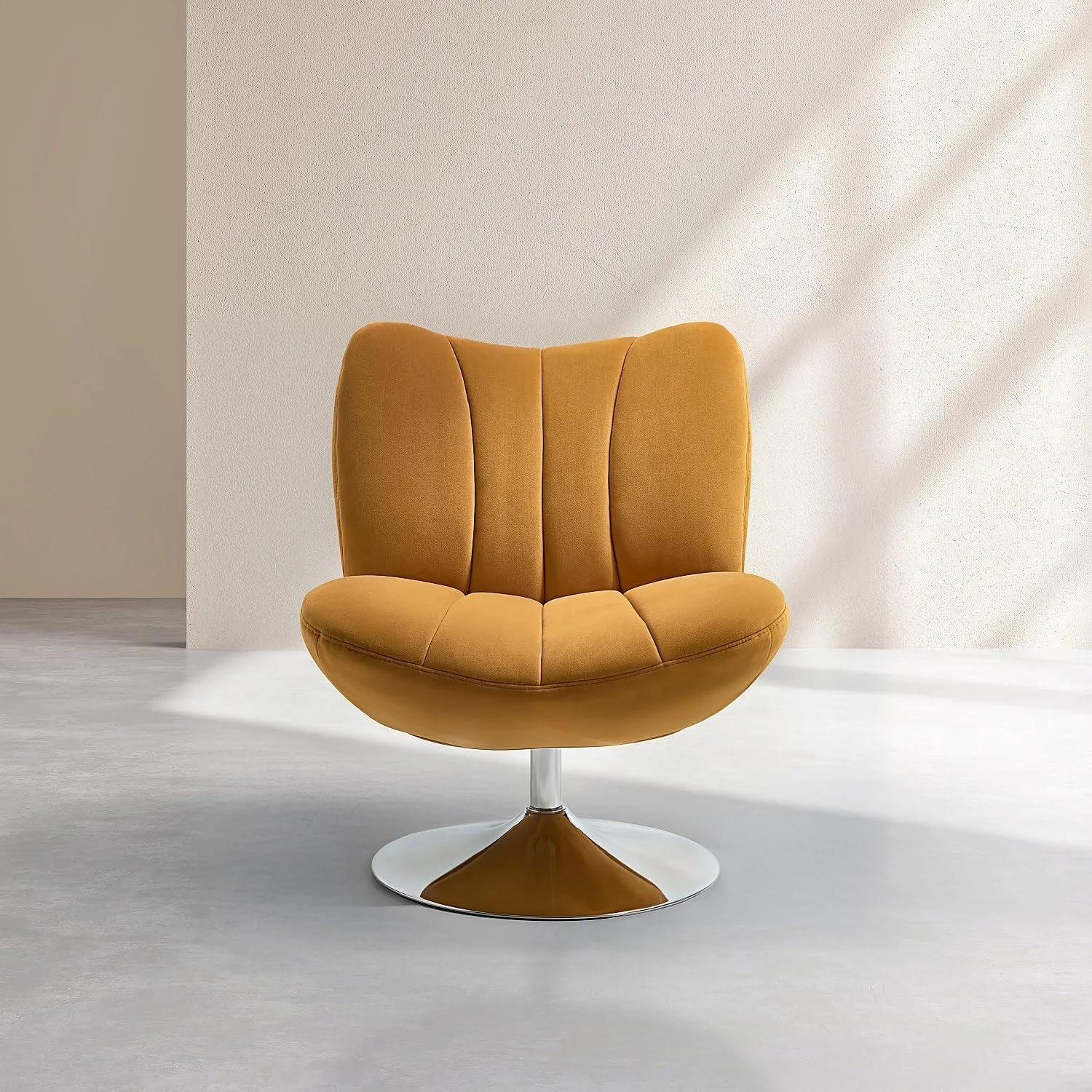 Le fauteuil pivotant Andrew est équipé d'un matelassage vertical. Son pied en métal chromé accompagne son revêtement en tissu couleur miel.