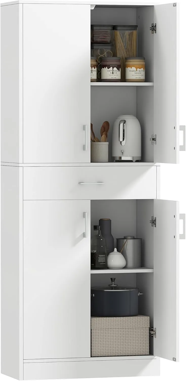 Armoire de rangement pour cuisine avec design blanc uni et poignées en aluminium. Dotée de 2 placards à double portes avec étagère réglable en hauteur et tiroir central, elle offre un espace suffisant pour ranger assiettes, vaisselle et autres affaires. Conçu en MDF, facile d'entretien, avec fixations murales pour éviter les basculements. Meuble multifonction adapté pour bureau, cuisine, salon ou chambre. Comprend rangement pour livres et fournitures de cuisine ou pour afficher des objets. Dimensions totales : 70,8l x 34P x 180H cm ; Charge max. recommandée : 20 kg (total), 5 kg (étagère et tiroir).