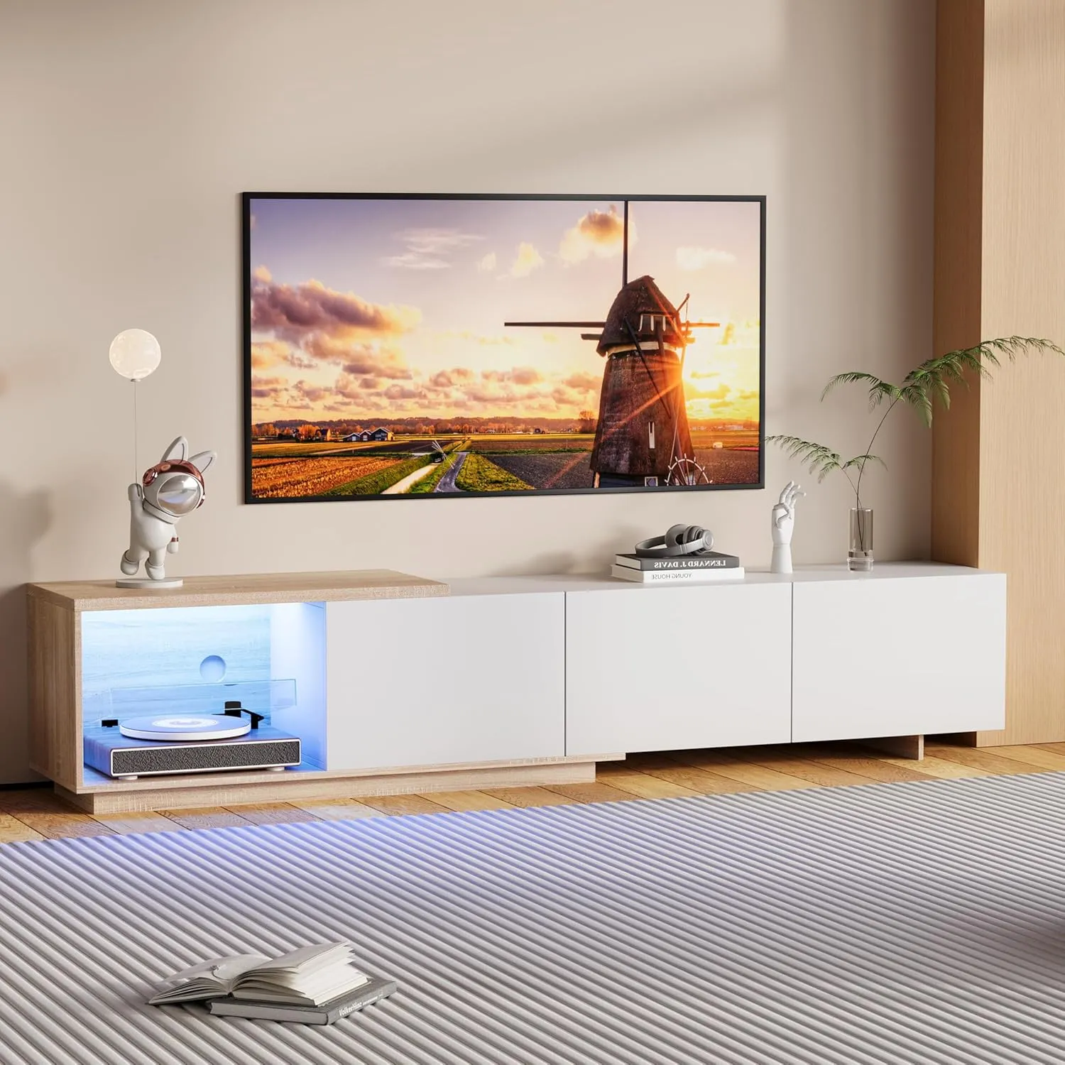 Meuble TV LED Moderne Extensible pour Téléviseur jusqu'à 75 Pouces, avec 3 Tiroirs et Rangement Ouvert pour Salon (Blanc)