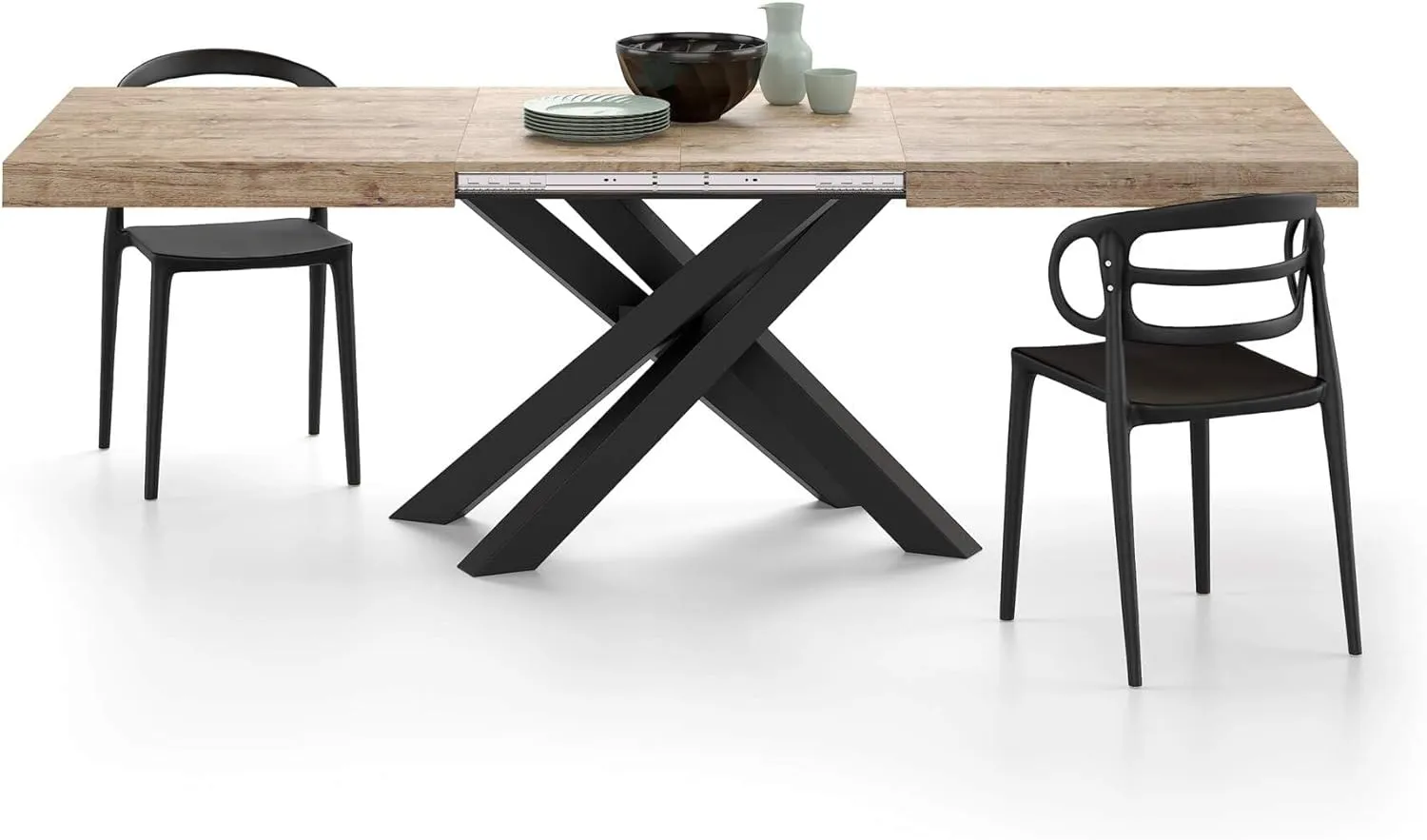 La table extensible Emma Chêne Naturel mesure 160 cm fermée et peut s'étendre jusqu'à 240 cm en utilisant deux rallonges. Les pieds croisés au centre offrent un espace pratique pour ranger les chaises. Les chaises sont disponibles séparément. Les rallonges et le plateau sont en mélamine, facile d'entretien, avec un mécanisme en métal galvanisé pour l'extension. Les pieds sont en fer avec un revêtement en poudre, conçus pour un usage intérieur. Les rallonges peuvent être stockées sous le plateau, avec un compartiment prévu pour les couverts et le linge de table. La table associe un style industriel et moderne, offrant de la personnalité à tout environnement. Fabriquée en Italie, elle est conçue et produite dans nos usines italiennes.